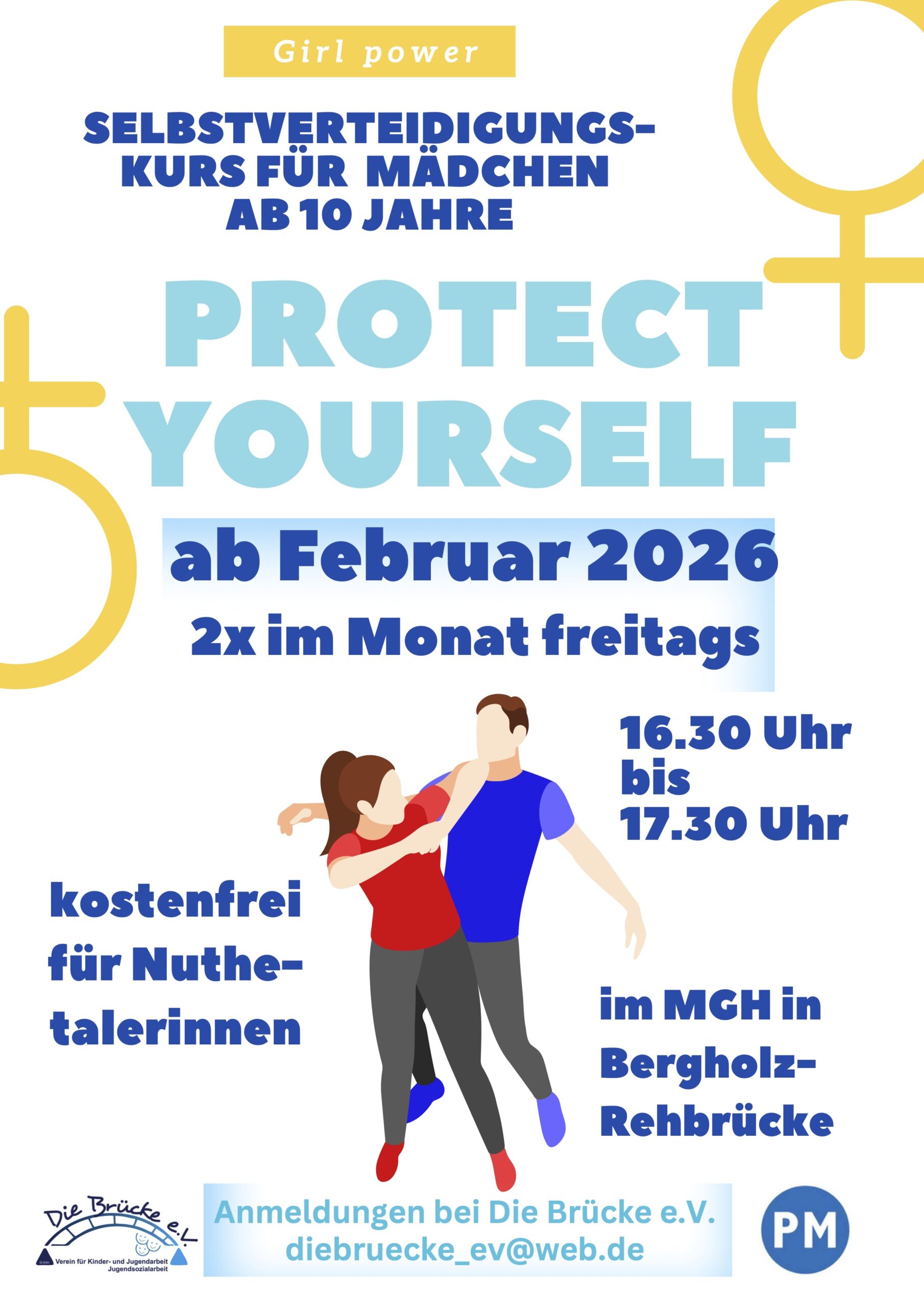 Ab Februar findet der Selbstverteidigungskurs bei uns statt! Mädchen ab 10 Jahre, die lernen wollen, wie sie sich in kritischen und gefährlichen Situationen verhalten können, selbstbewusst und stark auftreten wollen, können dies bei uns mit ausgebildeten Trainer*innen lernen und üben. Zweimal im Monat findet der kostenlose Selbstverteidigungs- und Selbstbehauptungskurs jeweils freitags von 16.30 bis 17.30 Uhr bei uns statt.